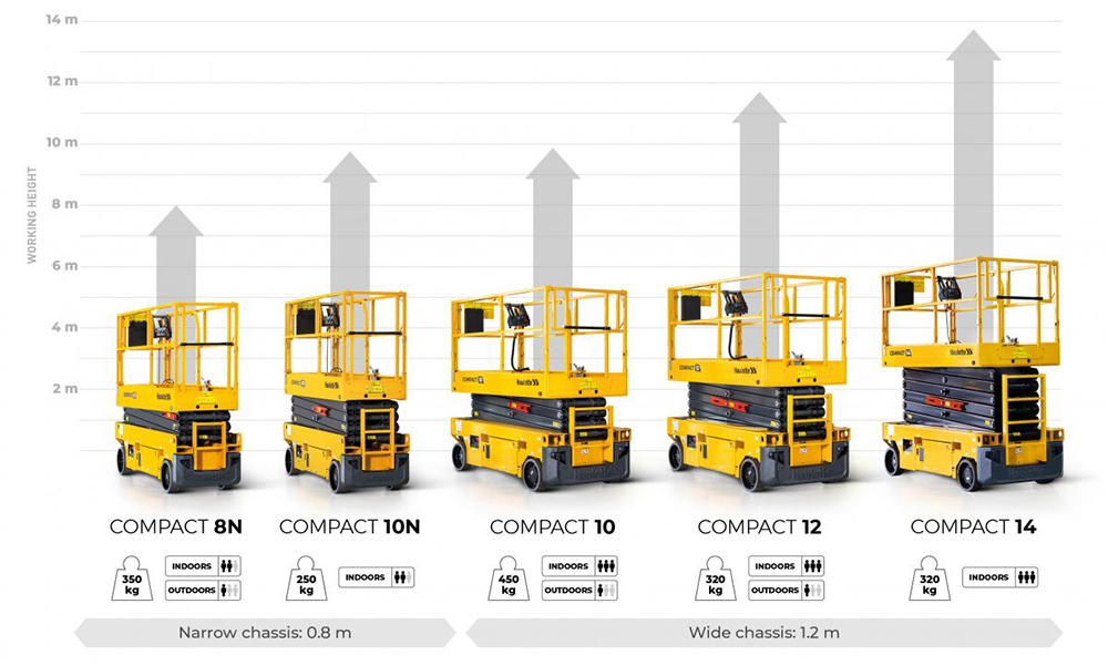 The new additions offer working heights, from 8 to 14m and load capacities from 250 to 450kg, while the COMPACT 8N, 10 and 12 models can operate indoors and outdoors without height or load restrictions.