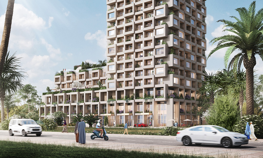 The structure will offer studio, one- and two-bedroom apartments and deluxe penthouses, and is to stand on a terraced podium with shared and private gardens, shops and a common pool.