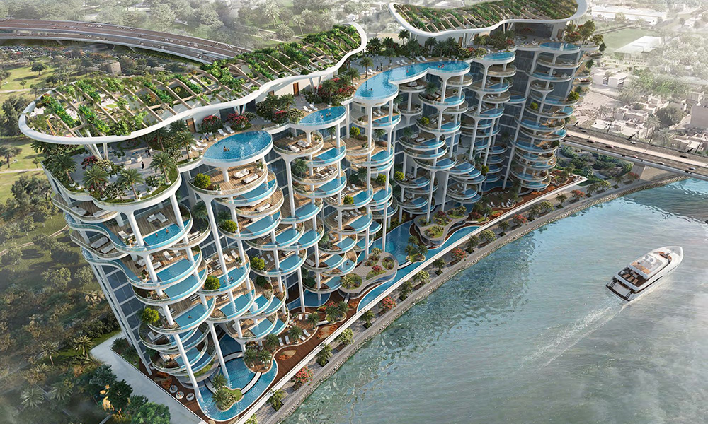 The project is a low-rise 14-storey building featuring 70 units comprising of three-, four-, and five-bedroom duplex sky villas and duplex penthouses. Each unit will have its own private infinity pool and terrace garden. Residents will have views of Dubai Canal and Burj Khalifa on one side, while on the other, views of Burj Al Arab will be available.